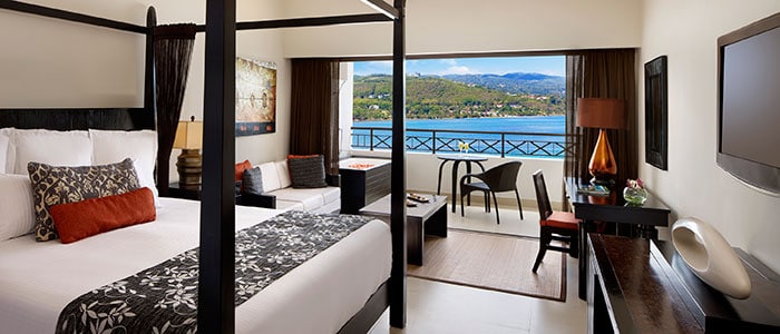 King bed or 2 queen beds, oversized room with separate sitting area, hydrotub in bathroom, private furnished terrace with soaking tub and direct swim out access to pool with ocean views. Preferred Club privileges included.